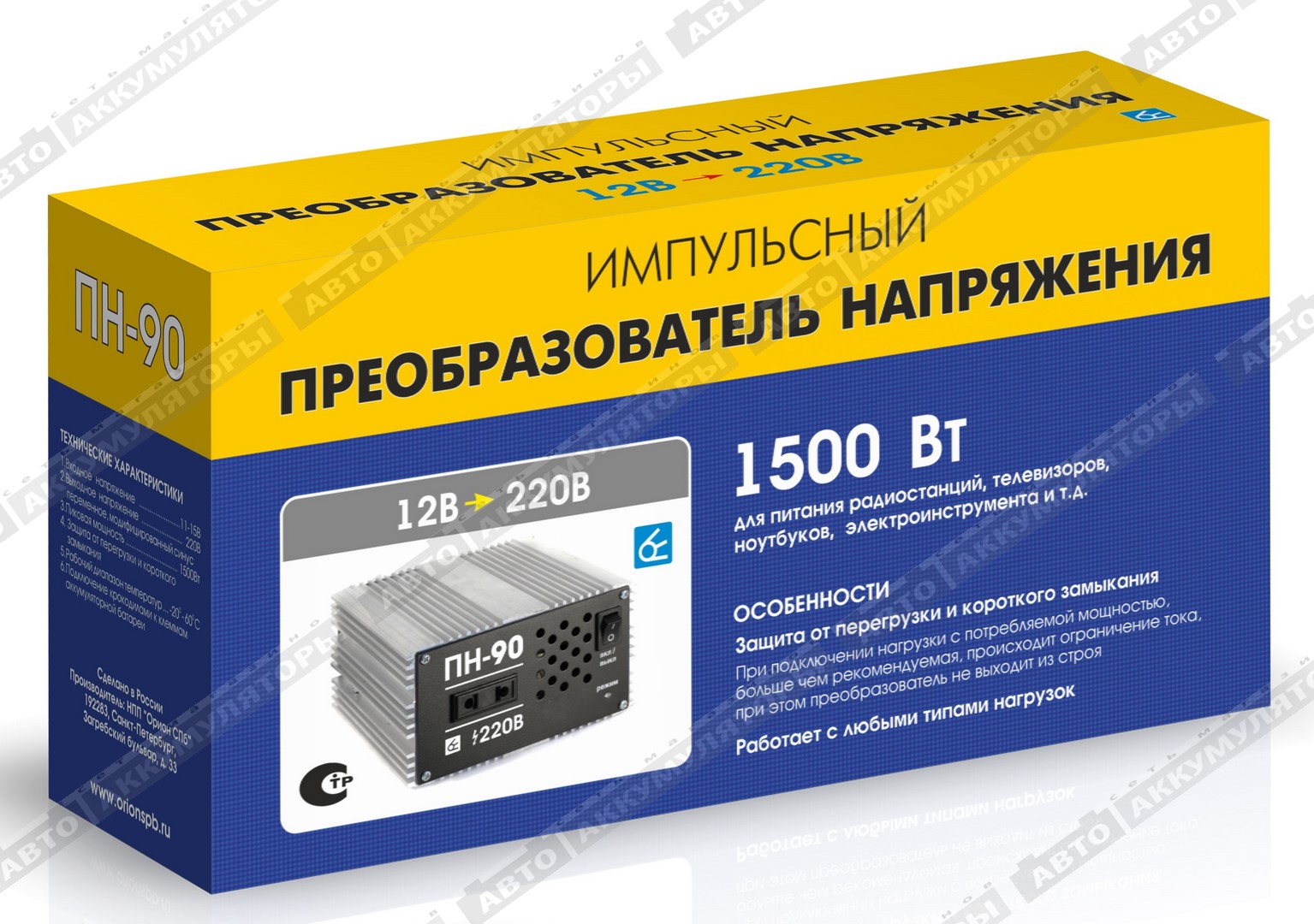 Импульсный преобразователь напряжения Вымпел ПН-90, он же инвертор, служит для преобразования напряжения 12В в эффективное напряжение 220В, модифицированный синус, благодаря чему от бортовой сети автомобиля можно запитать почти любые бытовые приборы (мобильный телефон, фен, утюг, ноутбук и т.д.)